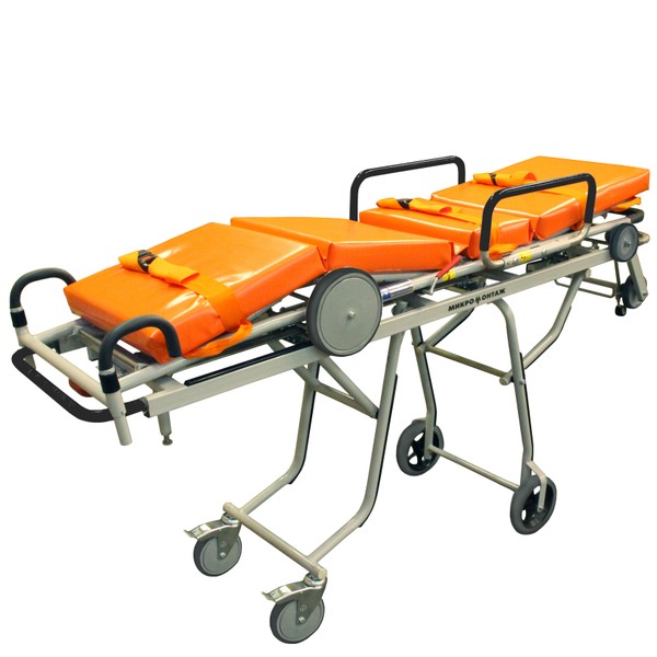 Трансформация ложа обеспечивает функциональные положения тела пациента, т.к. ноги согнуты в коленях, изголовье приподнято. Наклон головной секции регулируется с помощью телескопического фиксатора. К раме носилок прикреплены ремни безопасности. На ложе носилок лентой "репейник" крепится мягкий ПВХ матрац.